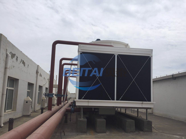 橫流式玻璃鋼冷卻塔內(nèi)的填料采用兩面有凸點的點波片,通過安裝頭使點波片粘結(jié)成整體,以提高剛性,兩面的凸點還可避免直接滴水,因此提高了水膜形成能力,填料尾部設(shè)有收水措施。